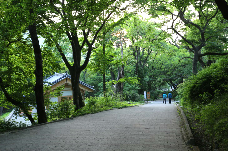 푸른 나무가 우거진 숲길을 따라 방문객이 갑사로 향하고 있다.