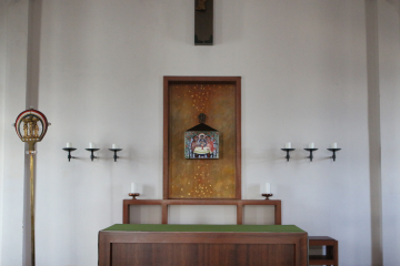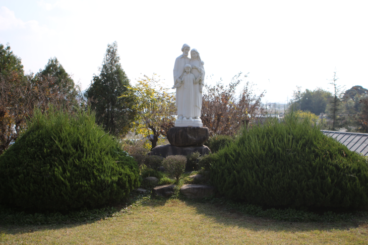 성당 입구에는 성인요셉과 마리아, 예수가 함께 서있는 성가정이 세워져 있다.