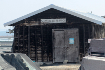 소금 창고에 '노력 정성 깨끗이'라고 쓰인 낡은 현판이 걸려 있다.2