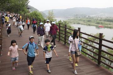 '금강로하스축제'를 찾은 사람들이 대청공원의 수변 데크를 걷고 있다.2
