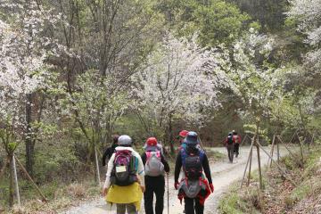 보곡산골을 찾은 탐방객이 벚꽃이 만개한 산꽃 술래길을 걷고 있다.2