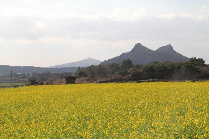 추사유배길 3코스 사색의 길에서 멀리 보이는 단산과 눈부신 유채꽃밭의 절경.