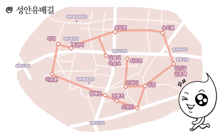 성안유배길은 옛 제주성 자리를 중심으로 남아있는 유배지 터를 잇는 길이다. 이 일대는 과거 제주 역사와 문화의 중심지였던 만큼, 관아가 있어 유배인들도 많이 머물렀다. 성안유배길을 거친 이들은 무려 200여 명에 이르러 일일이 나열하기도 힘들 정도. 그중 알만한 이들을 꼽자면, 가장 먼저 떠올릴 사람은 바로 광해군이다. 제주 유배인 중 유일하게 왕이었던 인물로, 인조반정으로 왕위에서 쫓겨난 후 유배됐다. 조선 후기 정치·사상계를 호령했던 우암 송시열도 세자 책봉에 반대하는 상소로 1689년 제주에 유배되었다가 서울로 압송 중에 정읍에서 사약을 받았다. 이 밖에도 인목대비 폐위를 반대하다 유배된 이익, 조선말기 을미사변에 연루된 김윤식을 더불어, 규암 송인수, 동계 정온, 충암 김정 등 조선의 고위 대신이자 학자들이 이곳을 거쳤다.