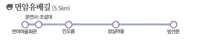 조선 말기의 대표적 유학자인 면암 최익현의 유배길은 그의 호를 따 면암 유배길이라 불린다. 약 2년간 제주에서 유배했던 면암의 생활 속에서 그가 남긴 사색과 흔적을 느낄 수 있는 길로 2012년 개장했다. 제주시 오라동 일대, 연미마을회관에서 시작해 방선문계곡으로 이어지는 5.5km가량의 코스. 출발점에서 10분 정도를 걸으면 가장 먼저 만나는 것이 문연사로, 면암과 교류하던 유학자 이기온이 칠봉서당을 세워 후학을 양성하던 곳이다. 후에 불에 타, 문연서당이 들어섰고 최익현과 이기온을 추모하는 의미의 문연사가 오늘에까지 이어진다. 지금은 도시개발로 인해, 옛터에서 조설대 주변으로 옮겨졌다. 조설대는 한일합방 후 조선의 수치를 설욕하겠다는 의미로 그 한자(朝雪臺)를 새긴 언덕인데, 면암의 애국심과 희생정신이 느껴지는 장소다. 한일합방 이후 제주에서 조직된 비밀결사 조직, ‘집의계’의 일원이 그의 후학이었다고 한다.