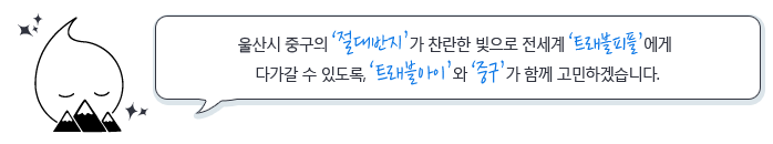 울산의 정치, 경제, 문화, 행정의 중심지로서 역할을 다해온 중구는 현재 혁신도시 건설과 구도심 재개발을 통해 도시 전체를 새롭게 바꿔내고 있다. 동시에 다양한 거리 사업을 통해 타 지역과 차별화된 문화예술 브랜드를 창출해가고 있다. 수많은 역사자원을 소중히 가꿔내고 그 속에 지속적인 도시 성장과 발전을 이룩해내고 있는 중구의 힘은 바로 ‘주민 중심의 더 나은 삶’이다. 그러면서 중구만의 관광산업에 품격 있는 삶도 함께 녹여내고 있다.