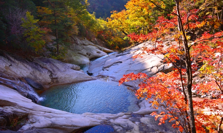 가을이면 십이션녀탕 주변은 곱게 물들어 푸른 물과 어울려 절경에 이른다.