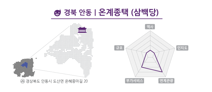 종택이라 함은 으레 약간은 낡고 세월의 흔적이 묻어나야 하거늘 어쩐지 온계종택(삼백당)은 지난 세월이 비껴간 듯 밝고 환하며 새것의 느낌이 난다. 전통문화를 계승하고 선비정신이 깃들어 있다는 온계종택은 이래 봬도 500여 년의 역사를 자랑하는 종갓집이다. 안동시 도산면으로 들어서면 큰 노거수가 마을로 들어왔음을 알린다. 온계 이해가 직접 심었다는 밤나무는 굵기와 높이만으로도 그 수령을 짐작할 수 있을 정도다. 밤이 실하게 열릴 가을이면 밤이 주렁주렁 열리며 갈색빛과 더없이 잘 어울리는 종택의 멋도 한껏 물이 오른다. 사람들이 온계종택을 찾는 이유는 퇴계 선생과 더불어 온계 선생이 머물던 곳이라는 역사적인 의미와 선비정신의 기틀을 다지고자 함에 있다.