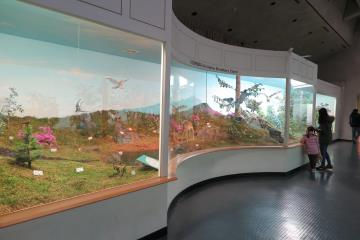 자연사전시실에 전시된 각종 동식물들이 당장이라도 튀어나올 듯 생생하다.자연사전시실은 제주도만의 특별한 자연경관 및 생태를 알아볼 수 있는 곳이다. 이에 앞서 세계자연유산 전시관을 먼저 살펴보자. 이 전시관에서는 우리나라 최초 세계자연유산인 ‘제주 화산섬과 용암동굴’을 포함해 한라산 천연보호구역 등 그 가치가 높이 평가되고 있는 세계자연유산을 자세한 설명과 함께 동영상으로 관람할 수 있다. 자연사전시실에는 세계 7대 자연경관으로 선정된 제주의 시기별 형성과정과 화산탄, 용암석 등의 화산암석을 볼 수 있다. 특히 자연사 전시실에서 눈여겨 볼 수 있는 부분은 육상생태전시부분이다. 앞날개 끝이 갈고리 모양으로 구부러져 있는 갈구리나비와 한라산 계곡이나 산림지대에 주로 분포하는 오소리 등 여러 동식물 표본을 한 쪽 벽면 가득 동적으로 전시한 모습을 보고 있으면 마치 청정한 숲 한 가운데에 서 있는 듯 상쾌한 느낌을 받을 수 있다.