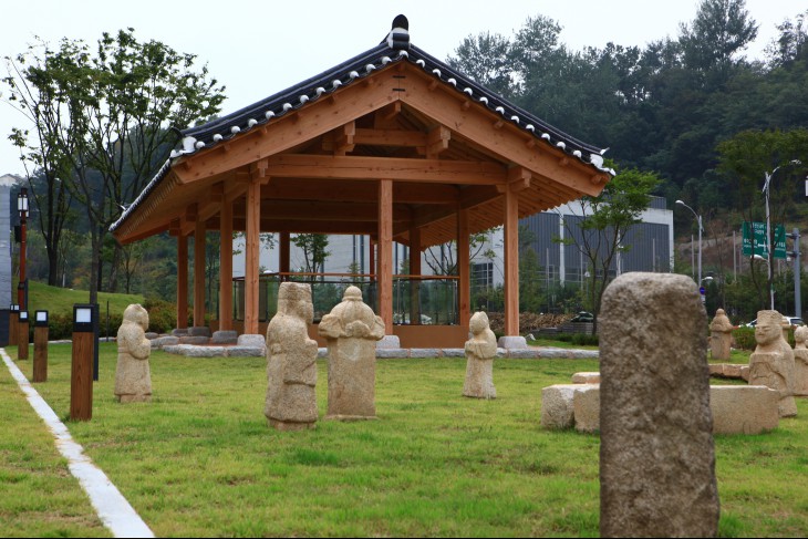 한옥박물관 외부에에 전시되어 있는 조선시대의 석물과 신라시대 기와가마터.