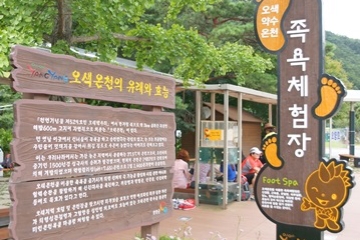 오색약수터 주변 오색마을 내에는 온천수에 발을 담글 수 있는 족욕체험장이 있다.강원도 양양군 오색리, 지금으로부터 500여 년 전 남설악에 해당하는 이곳에서 성국사(오색석사)의 승려가 커다란 바위로부터 솟아나는 물을 발견했다. 그 때 약수가 솟는 주변으로 다섯 색깔이 보이는 ‘오색화’가 피었다고 하여 ‘오색약수’라 했고 현재에 이르고 있다. 여기서 말하는 오색화란 지금의 복사꽃(복숭아꽃)을 말한다. 마을 이름 역시 복사꽃이 많이 피기 때문. 오색약수의 특이한 점은 산성과 철분이 많은 탄산수라 맛도 톡 쏘는 맛이 난다는 것으로 이 때문에 위장병과 신경통 등 질병에 효험이 있다고 한다. 불과 30년 전만 하더라도 그 물을 먹고 병을 고치려 찾아오는 이들도 많았단다. 지금은 설악산 등반의 기운을 보충하려고 오기도 한다. 2011년에는 오색약수라는 정식명칭으로 천연기념물로 지정되며 가치를 더욱 인정받았다.
