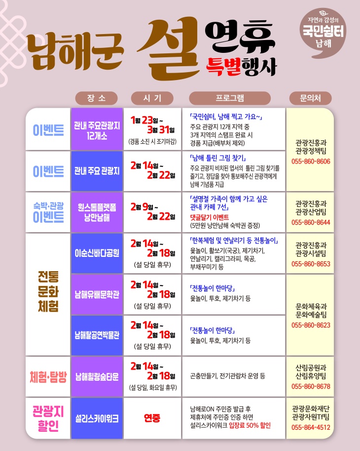 먼저 올해 설 연휴 특별행사의 일환으로 인기 관광지 12개소에서 진행되는 ‘국민쉼터, 남해 찍고 가요’ 스탬프 투어 이벤트가 1월 23일부터 3월 31일까지 열린다. 참가자는 남해군의 주요 관광지 12개 지역 중 3곳을 방문해 관광지에 마련된 스탬프를 찍으면 소정의 경품을 받을 수 있다. 본격적인 설 연휴인 2월 14일부터 22일까지는 주요 관광지에서 ‘남해 틀린 그림 찾기’ 이벤트가 진행돼, 틀린 그림 찾기 미션을 성공하면 남해 기념품을 받을 수 있다.
